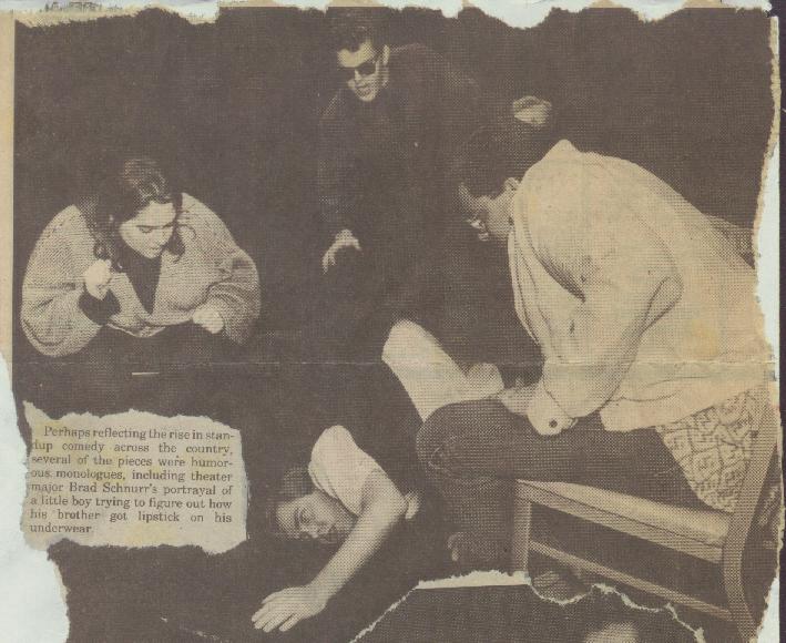 [From an article which appeared in the Daily Iowan on October 3rd, 1988.] (Cheryl Snodgrass, Dan Layne, Oliver Oertel seated, Greg Jackson ear to the ground.) (Todd Ristau and his skeletal lover)