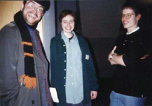 A picture taken after a No Shame Theatre performance, circa Feb. 1997. Pictured are (left to right) James D. Wolf, Jr., Carolyn Space Jacobsen and Ben Zolno.