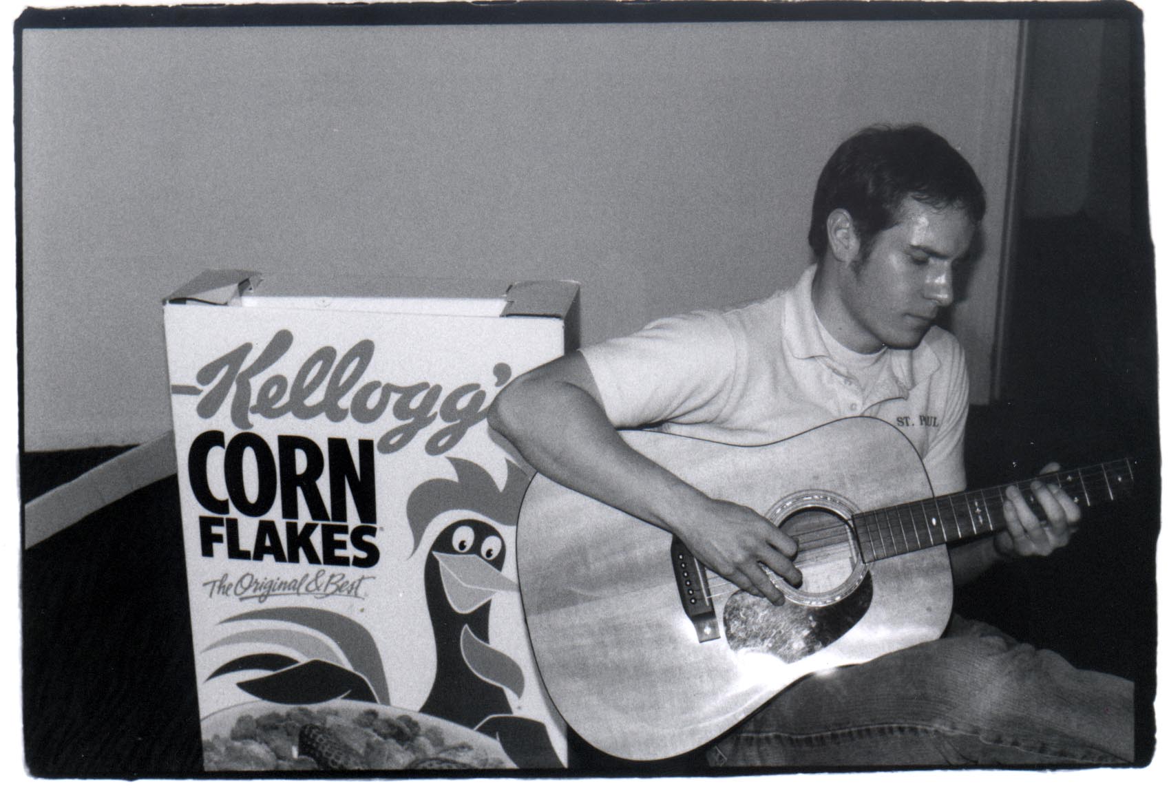 Brett Webster and the cereal box from A Giant Box of Corn Flakes Sings the Blues