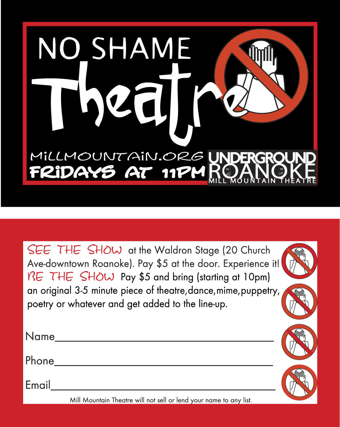 This is the front and back of the combo business card and punchcard for Roanoke No Shame (circa May 2004) Graphic Design by Michelle S. Bennett
