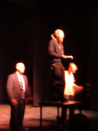 Jamal incites the audience into stomping and clapping. Once everybody has a good rhythm going, Al recites the following lines, reading from a bible he holds in his hands. James and Jamal will repeat everything he says.