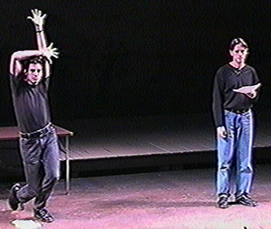 Loud in HeadTwo performers, dressed similarly. Backstage, a guy wearing a chicken mask and shoes on his hands waits.