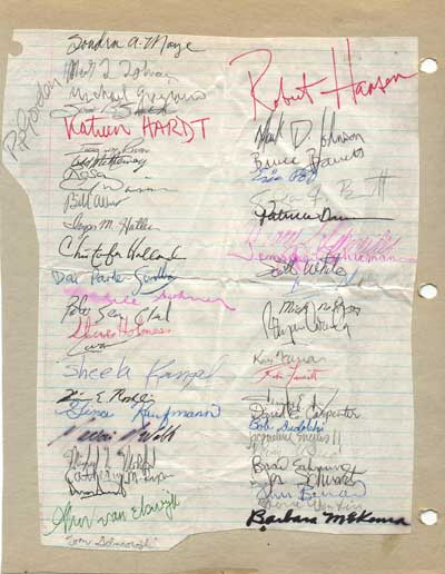 Robert Hansen Mark D. Johnson Bruce Barrett Eric Pot (?) F. B...tt (?) (Suzanne F. Bennett?) Patri... Dawson (?) Mary ? Schneider Jennifer Sahrman Scott White ?? M...? Mick M. Stroy Bryan Carmody Kris Farrar Robin Fawcett Jennifer E. ?? (Rives?) David E. Carpenter Bob Dudolski Jacquelyn Engholl Kevin Weed Brad Schnurr Jen Schwartz Jim Bena...? Nora Van Lieu Barbara McKenna |