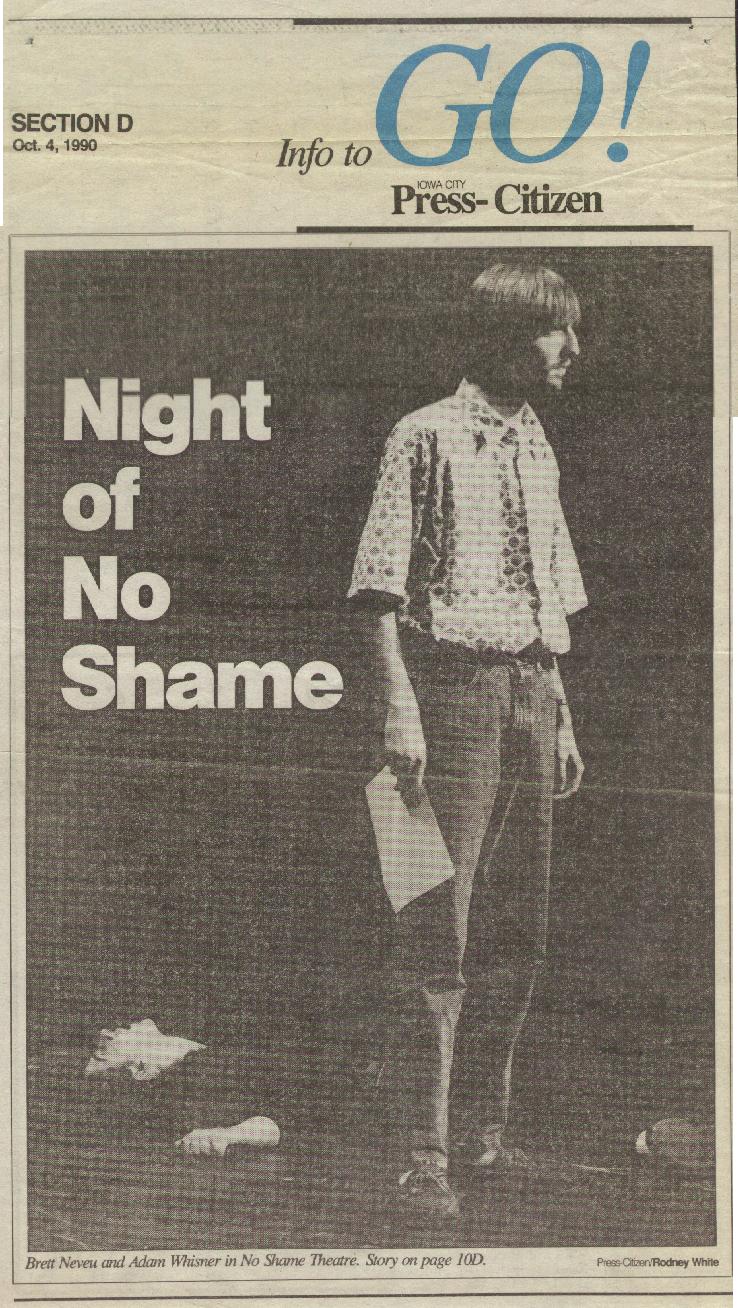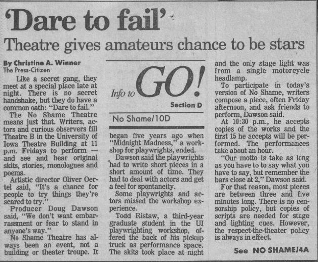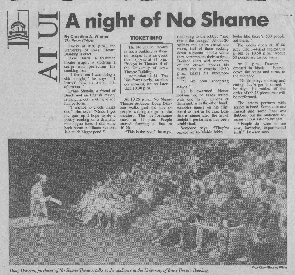 The No Shame Theatre means just that. Writers, actors and curious observers fill Theatre B in the University of Iowa Theatre Building at 11 p.m. Fridays to perform -- and see and hear original skits, stories, monologues and poems.