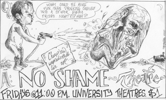 This poster was slathered on every surface of downtown Iowa City during the Fall 2000 season. It was garish bright yellow, though I have no copies of that incarnation. This is from the original art.