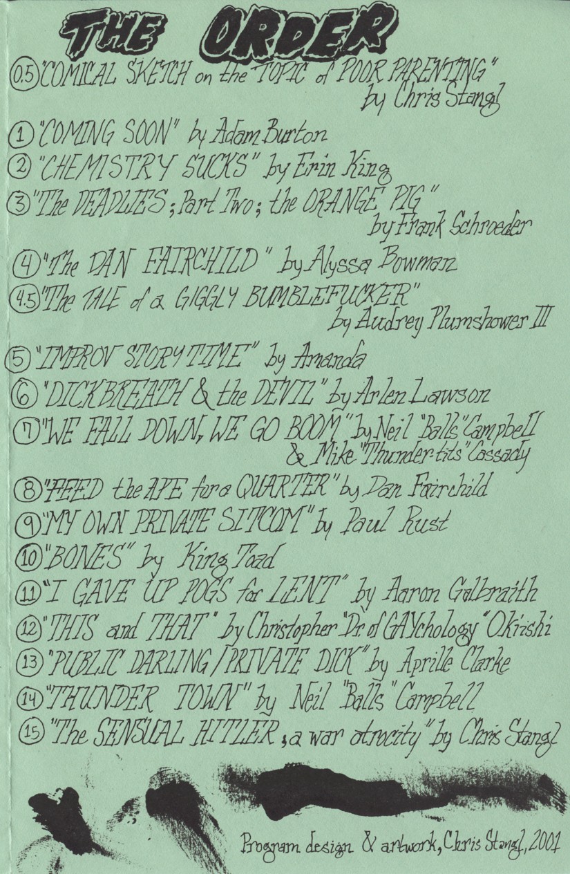 The first Chris Stangl "Best Of No Shame" program. Also the most discarded in a crumpled wad on the floor of Mabie Theater, hence the wrinkling on this authentic historical document.