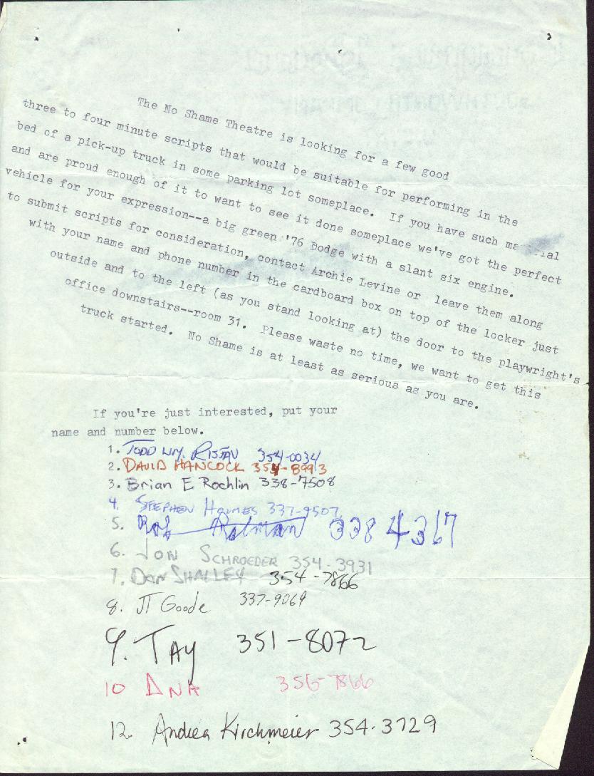 Not a "poster" per se, this was the actual sign up sheet posted on the call board to generate interest in No Shame. ---Goode