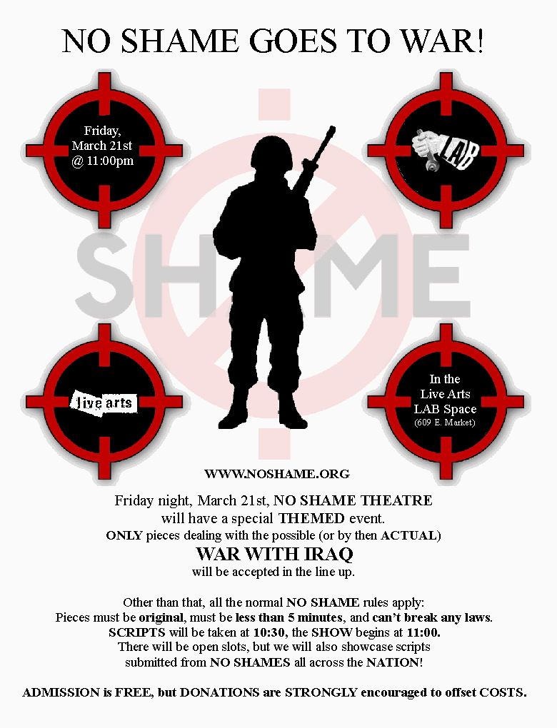 ONLY pieces dealing with the possible (or by then ACTUAL) WAR WITH IRAQ will be accepted in the line up.