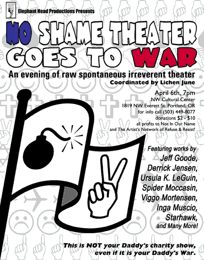 Have an opinion about terror, war, government, the current state of the world? Portland's production of NO SHAME GOES TO WAR is looking for a few good writers and performers for our April 6th charity show. Monologues, scenes, music, dance, poetry, hand puppets... anything 3 minutes or less that entertains and makes people think. Writers who are not in Portland can still submit scripts for consideration. And actors without scripts can be given material. If we get more submissions than we can perform in an evening, we may just have to do this again!